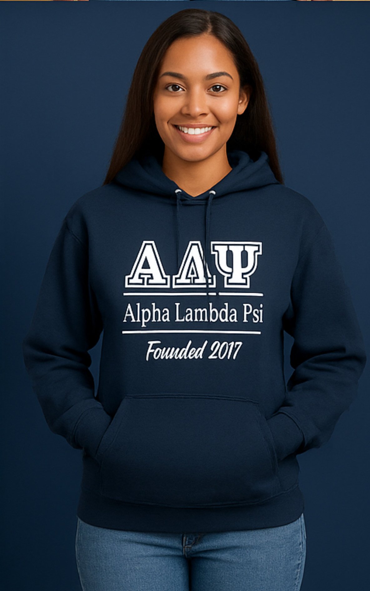 Show your pride with this stylish Alpha Lambda Hoodie. Made from soft, comfortable fabric, this navy top features bold Greek letters (ΑΛΨ) across the chest, along with the full organization name and “Founded 2017” printed below.